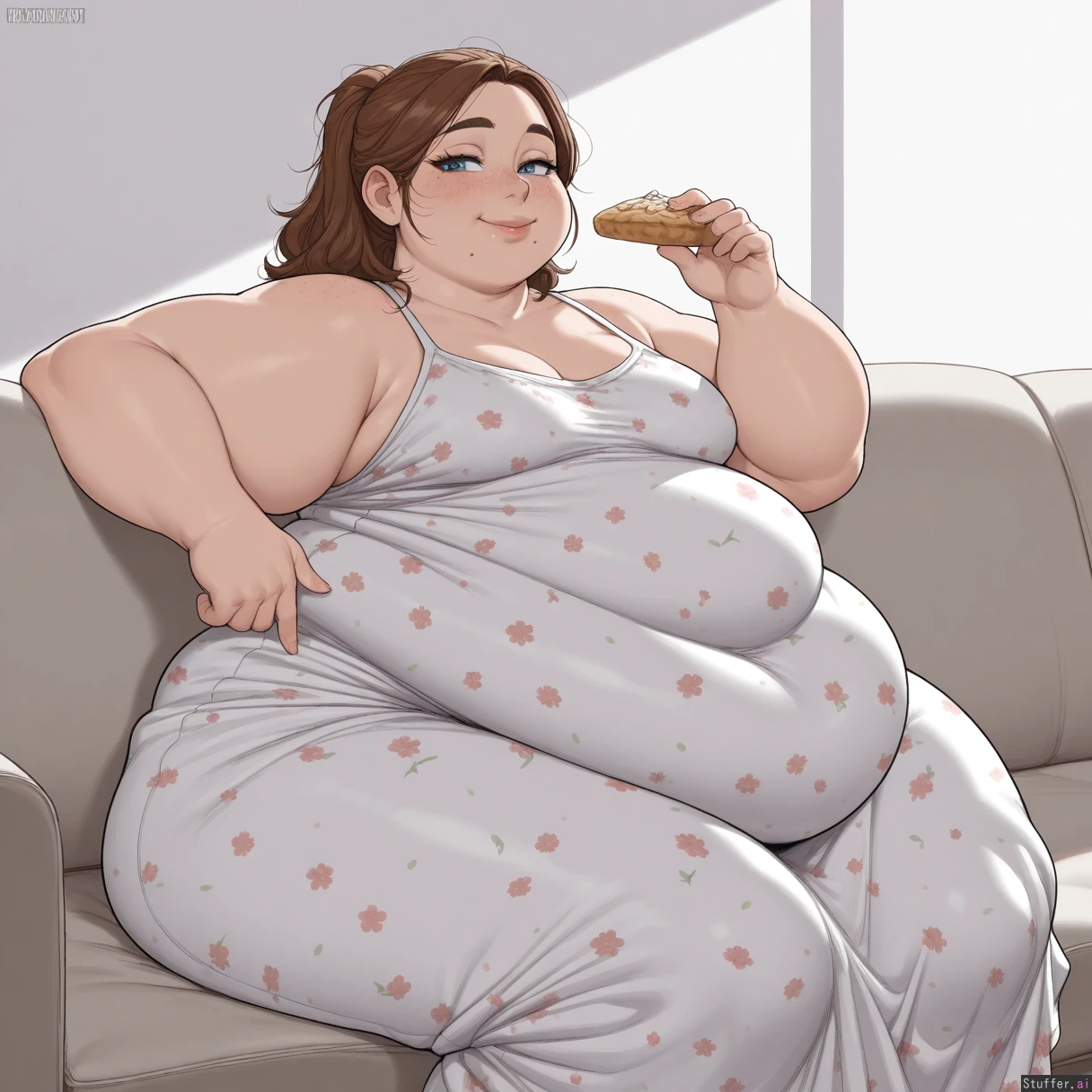masterpiece, best quality, Kamii momoru, krekkov, best quality, intricate details, hdr, detailed eyes, (soft shading), realistic, dim lighting, realistic lighting, 1girl, solo, Brown wavey hair, blue eyes, excited, flirty, American ussbbw girl, college aged, fat round face, fat double chin, full lips, freckles, bright blue eyes, long eyelashes, short brunette messy hair, bangs, loose ponytail, seductive smile, (obese, obese hips, hyper obese thighs, hyper obese belly, fat arms, medium breasts:1.3) Sitting on couch, wearing a floral print sundress, (eating pastries), full body
