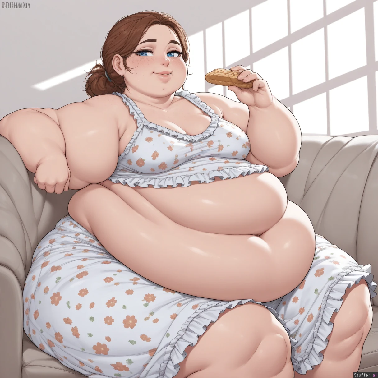 masterpiece, best quality, Kamii momoru, krekkov, best quality, intricate details, hdr, detailed eyes, (soft shading), realistic, dim lighting, realistic lighting, 1girl, solo, Brown wavey hair, blue eyes, excited, flirty, American ussbbw girl, college aged, fat round face, fat double chin, full lips, freckles, bright blue eyes, long eyelashes, short brunette messy hair, bangs, loose ponytail, seductive smile, (obese, obese hips, hyper obese thighs, hyper obese belly, fat arms, medium breasts:1.4) Sitting on couch, wearing a floral print sundress, (eating pastries), full body