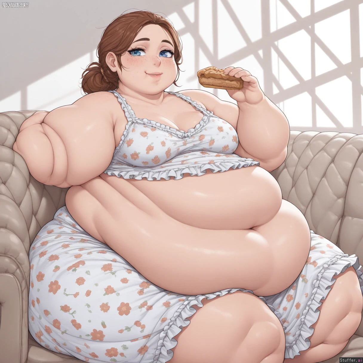 masterpiece, best quality, Kamii momoru, krekkov, best quality, intricate details, hdr, detailed eyes, (soft shading), realistic, dim lighting, realistic lighting, 1girl, solo, Brown wavey hair, blue eyes, excited, flirty, American ussbbw girl, college aged, fat round face, fat double chin, full lips, freckles, bright blue eyes, long eyelashes, short brunette messy hair, bangs, loose ponytail, seductive smile, (obese, obese hips, hyper obese thighs, hyper obese belly, fat arms, medium breasts:1.45) Sitting on couch, wearing a floral print sundress, (eating pastries), full body