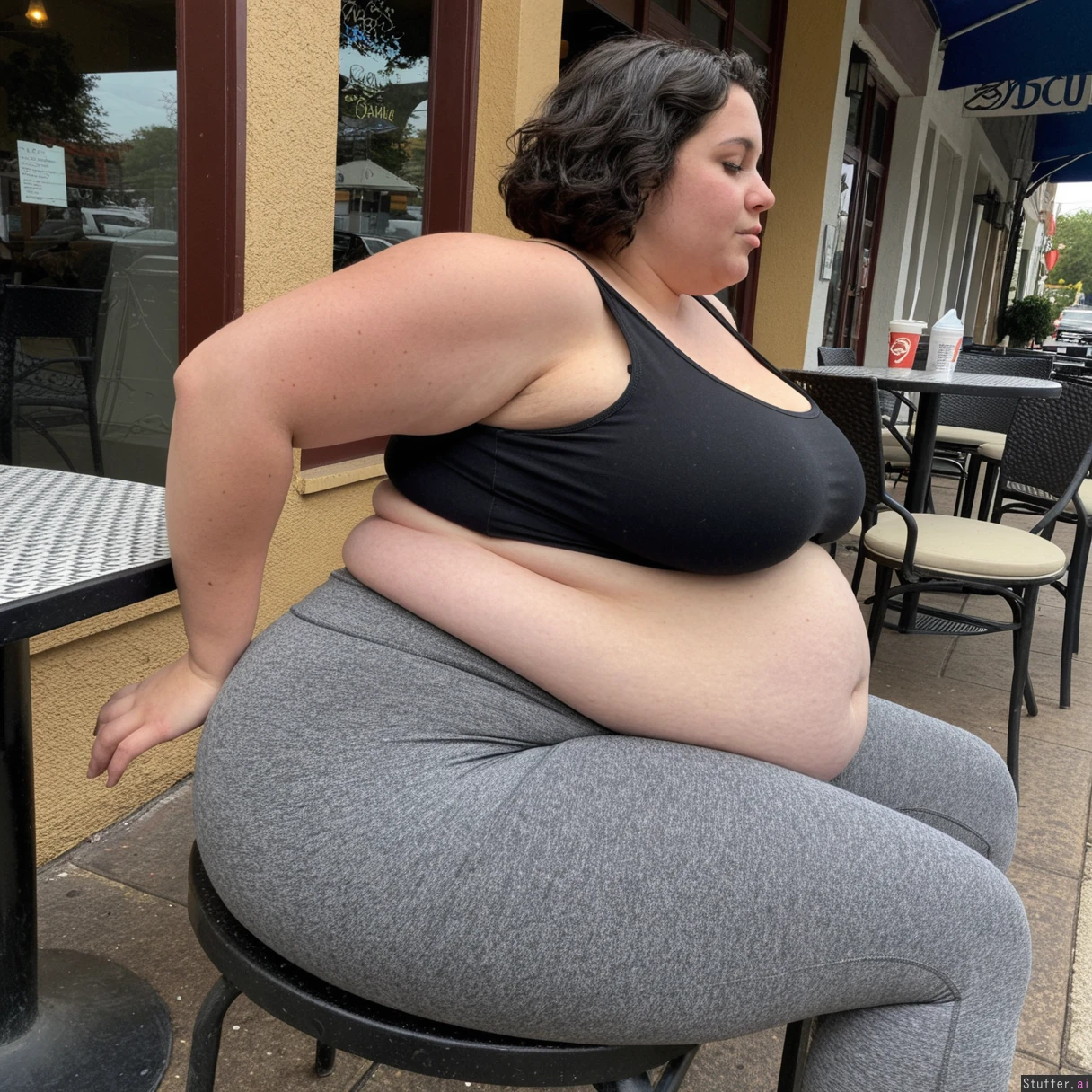 Beautiful Ssbbw, short hair, dark wavy bob cut, sitting at table, outdoor cafe, side view, (thick large thighs, soft wide hips) Thick waist, (tight gray leggings, black tank top), bursting thighs, (((huge round sagging belly))),