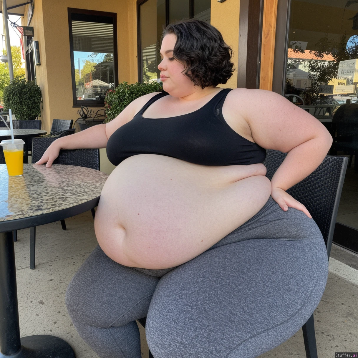 Beautiful Ssbbw, short hair, dark wavy bob cut, sitting at table, outdoor cafe, side view, (thick large thighs, soft wide hips) Thick waist, (tight gray leggings, black tank top), bursting thighs, (((huge round sagging belly))),