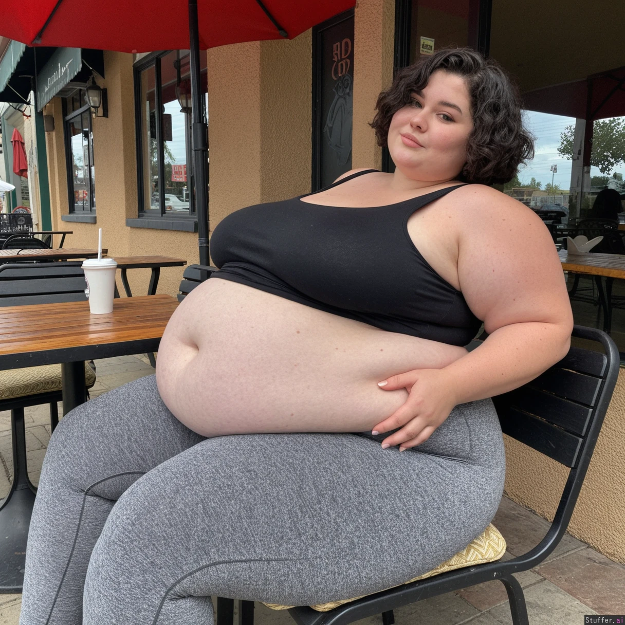 Beautiful Ssbbw, short hair, dark wavy bob cut, sitting at table, outdoor cafe, side view, (thick large thighs, soft wide hips) Thick waist, (tight gray leggings, black tank top), bursting thighs, (((huge round sagging belly))),
