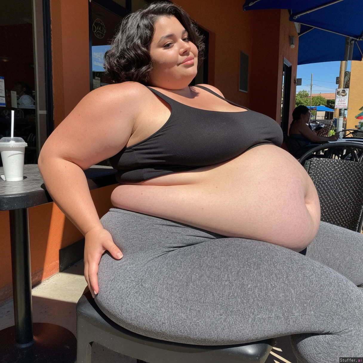 Beautiful Ssbbw, short hair, dark wavy bob cut, sitting at table, outdoor cafe, side view, (thick large thighs, soft wide hips) Thick waist, (tight gray leggings, black tank top), bursting thighs, (((huge round sagging belly))),