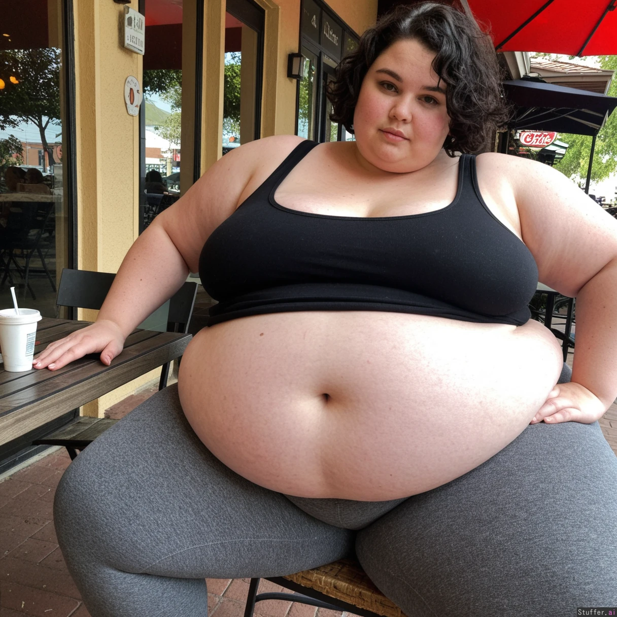 Beautiful incredibly fat Ssbbw, short hair, dark wavy bob cut, sitting at table, outdoor cafe, side view, (thick large thighs, soft wide hips) Thick waist, (tight gray leggings, black tank top), bursting thighs, (((huge round sagging belly, massive fat bloated belly))),
