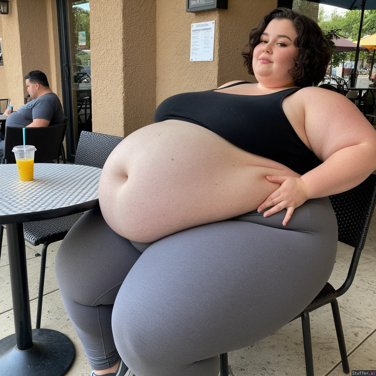 Beautiful incredibly fat Ssbbw, short hair, dark wavy bob cut, sitting at table, outdoor cafe, side view, (thick large thighs, soft wide hips) Thick waist, (tight gray leggings, black tank top), bursting thighs, (((huge round sagging belly, massive fat bloated belly))),