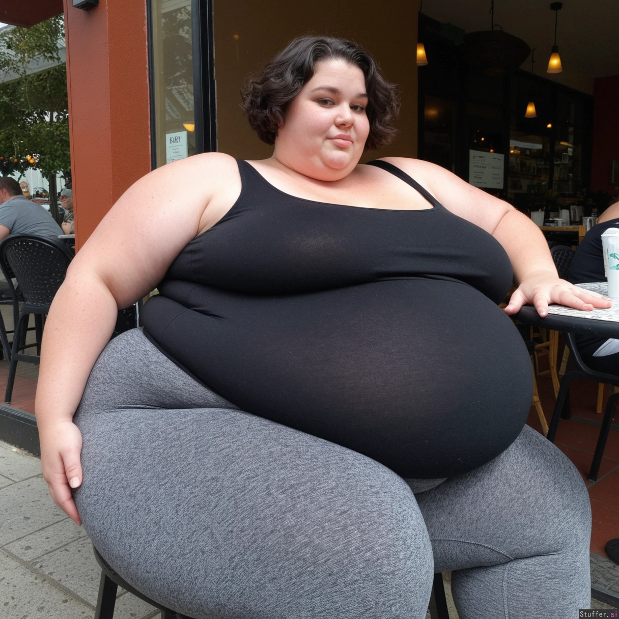 Beautiful incredibly fat Ssbbw, short hair, dark wavy bob cut, perfect supermodel face, sitting at table, outdoor cafe, side view, (thick large thighs, soft wide hips) Thick waist, (tight gray leggings, black tank top), bursting thighs, (((huge round sagging belly, massive fat bloated belly))),