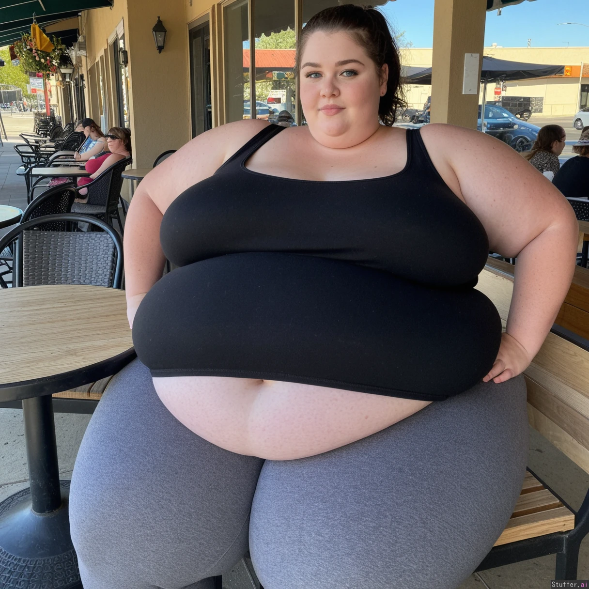 Beautiful incredibly fat Ssbbw, short hair, dark wavy hair, loose ponytail, naturally beautiful face, bright blue eyes, sitting at table, outdoor cafe, side view, (thick large thighs, soft wide hips) Thick waist, (tight gray leggings, black tank top), bursting thighs, (((huge round sagging belly, massive fat bloated belly))),