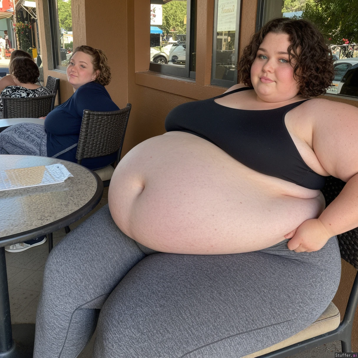 Beautiful incredibly fat Ssbbw, short hair, dark wavy bob cut, naturally beautiful face, bright blue eyes, sitting at table, outdoor cafe, side view, (thick large thighs, soft wide hips) Thick waist, (tight gray leggings, black tank top), bursting thighs, (((huge round sagging belly, massive fat bloated belly))),