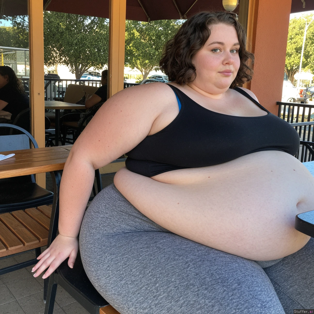 Beautiful incredibly fat Ssbbw, short hair, dark wavy bob cut, naturally beautiful face, bright blue eyes, sitting at table, outdoor cafe, side view, (thick large thighs, soft wide hips) Thick waist, (tight gray leggings, black tank top), bursting thighs, (((huge round sagging belly, massive fat bloated belly))),