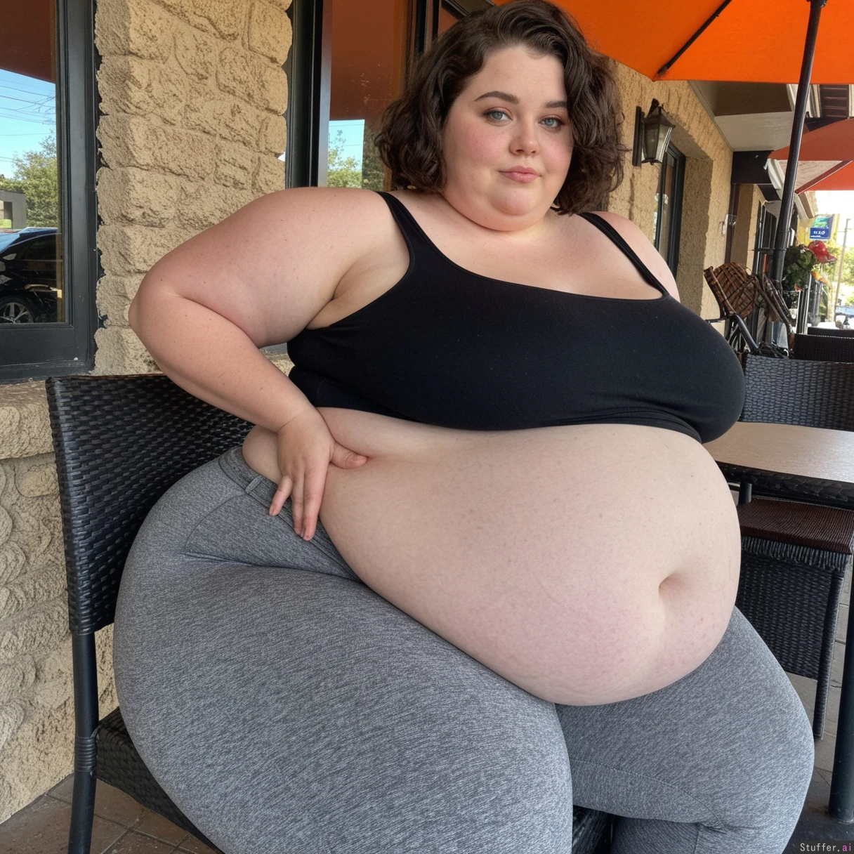 Beautiful incredibly fat Ssbbw, short hair, dark wavy bob cut, naturally beautiful face, bright blue eyes, sitting at table, outdoor cafe, side view, (thick large thighs, soft wide hips) Thick waist, (tight gray leggings, black tank top), bursting thighs, (((huge round sagging belly, massive fat bloated belly))),
