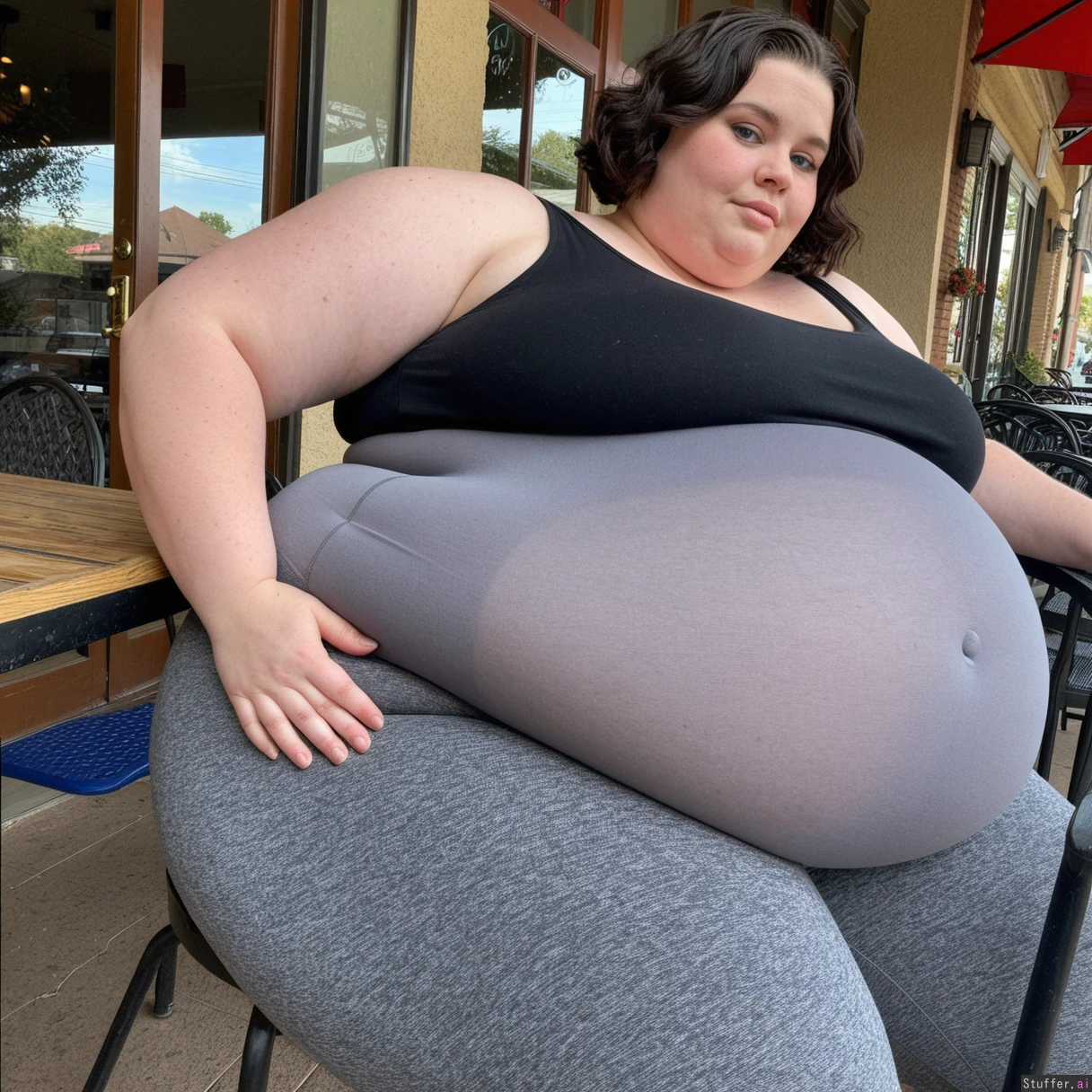 Beautiful (enormously fat Ssbbw), short hair, dark wavy bob cut, naturally beautiful face, bright blue eyes, sitting at table, outdoor cafe, side view, (thick large thighs, soft wide hips) Thick waist, (tight gray leggings, black tank top), bursting thighs, (((huge round sagging belly, massive fat bloated belly))),