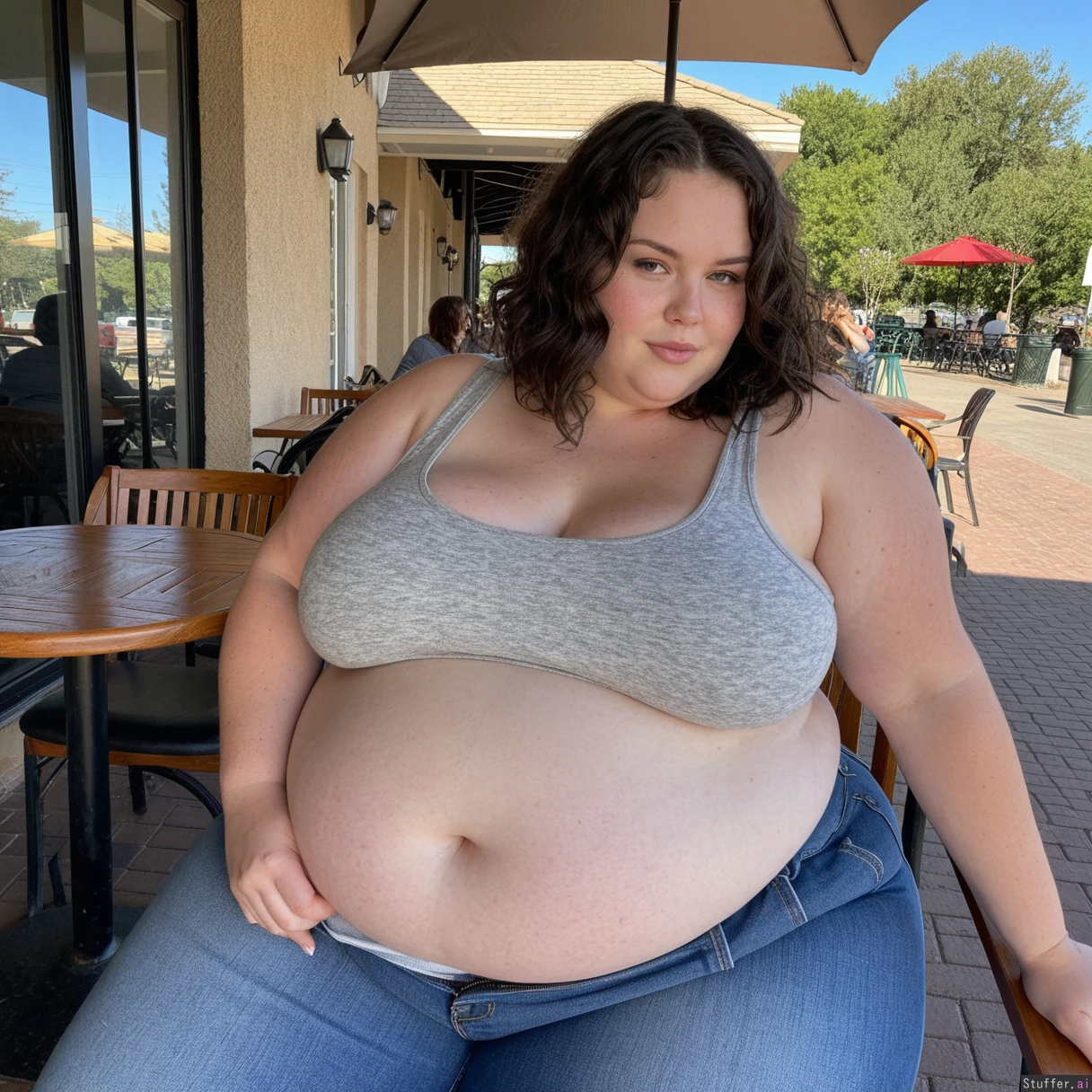 Exceptionally beautiful girl with a dark wavy bobcut and Hair covering one eye. (Very big ssbbw) Big belly, thick thighs. Wearing jeans and a gray tank top. At an outdoor cafe