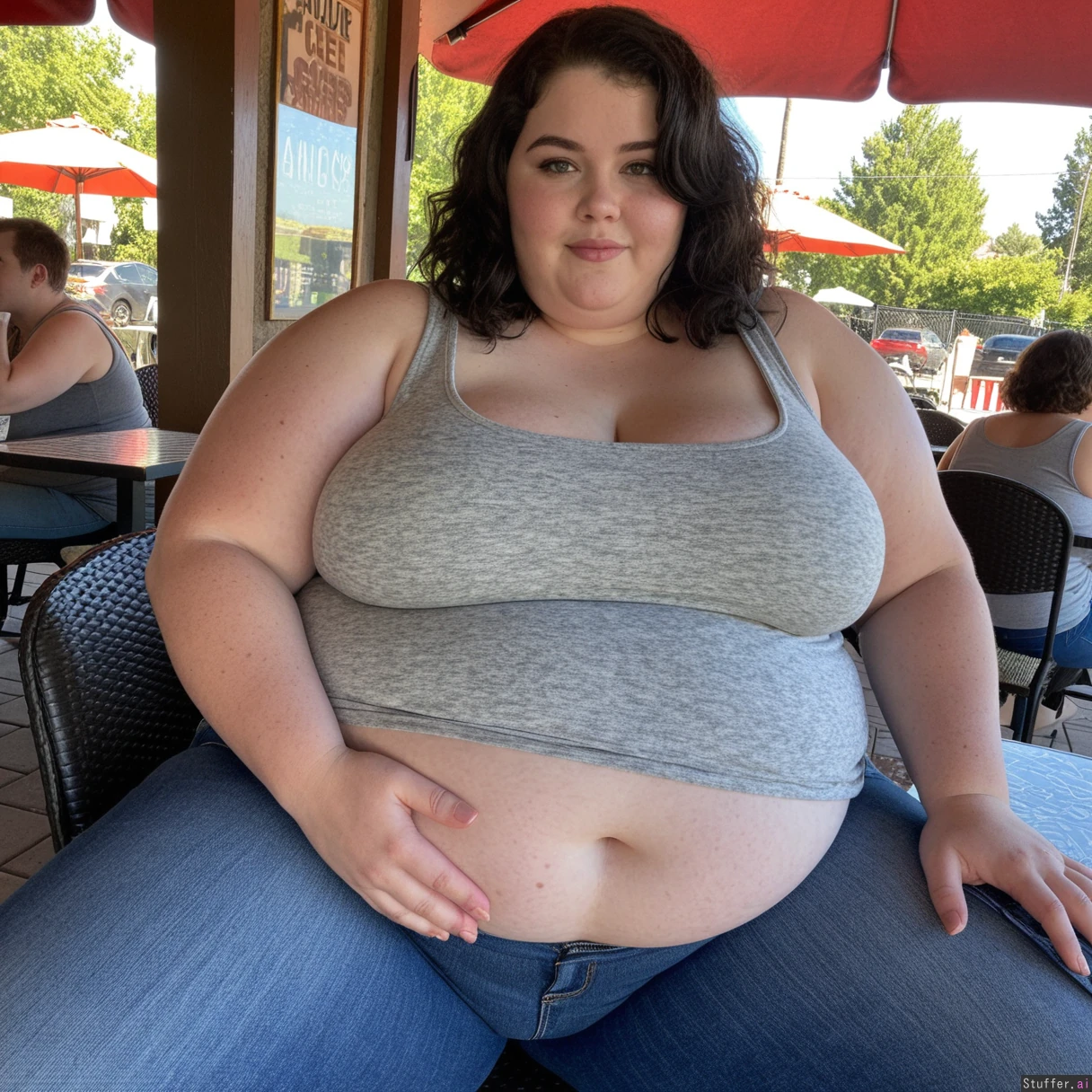 Exceptionally beautiful girl with a dark wavy bobcut (Very big ssbbw) Big belly, thick thighs. Wearing jeans and a gray tank top. At an outdoor cafe