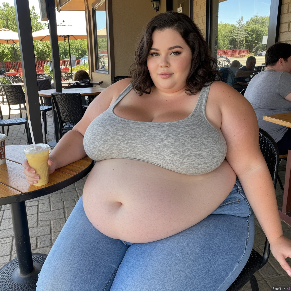 Exceptionally beautiful girl with a dark wavy bobcut (Very big ssbbw) Big belly, thick thighs. Wearing jeans and a gray tank top. At an outdoor cafe