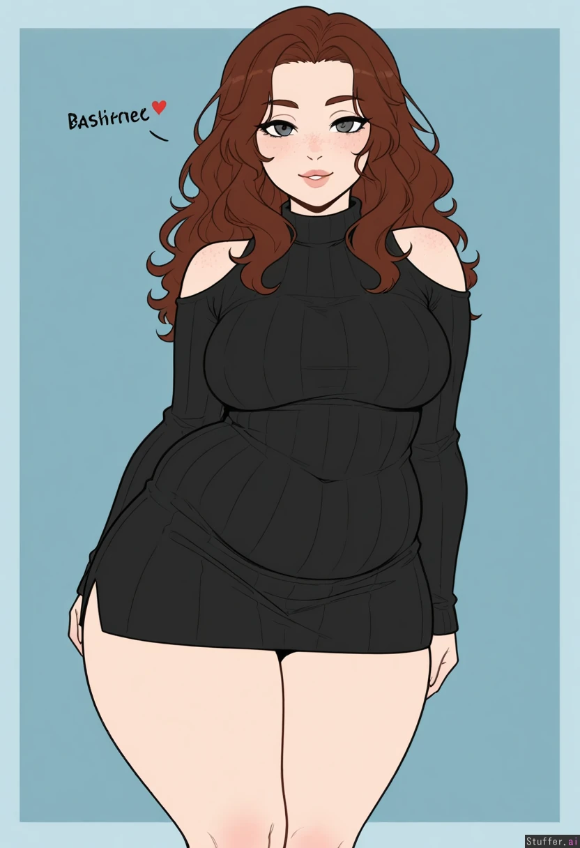 (Kinkymation(artist):0.5), (pudgeruffian(artist):0.3), Light blue background, 1woman, milf, solo, (simple style), ((less detail)), ((flat colors)), (((high rating))), ((highly detailed face)), high resolution, best quality, detailed eyes, Appearance: Long wavy dark hair, gray eyes, pale skin, freckles, bashful blushing, seductive sexy expression, breedable, soft beefy, supple burly, no-glasses, Outfit: (black skirt and snug black sweater shirt) fully clothed, SFW clothes, properly wearing clothes, full coverage clothes, snug clothes, long clothes, Action: looking at viewer, standing, posing, flirty, Modifiers: Stocky Thick figure:1.5, wide chubby hanging belly:1.2, muffintop, too thick, thick, fertile breedable feedee-breedee, bulked and plumping, Engorged round medium breasts:1, Chubby sexy waist:1.95, fat thick thighs:1.2, very wide hips:0.95, fat hips, slim arms, small shoulders, thunder thighs, large buttocks,