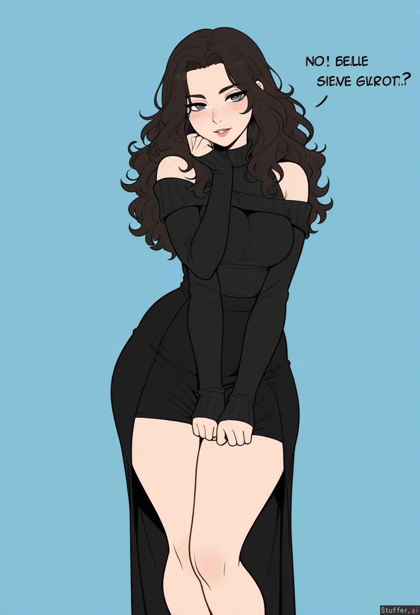 (Kinkymation(artist):0.5),(pudgeruffian(artist):0.3), Light blue background, 1woman, milf, solo, (simple style), ((less detail)), ((flat colors)), (((high rating))), ((highly detailed face)), high resolution, best quality, detailed eyes, Appearance: Long wavy dark hair, gray eyes, pale skin, freckles, bashful blushing, seductive sexy expression, breedable, soft beefy, supple burly, no-glasses, Outfit: (black skirt and snug black sweater shirt) fully clothed, SFW clothes, properly wearing clothes, full coverage clothes, snug clothes, long clothes, Action: looking at viewer, standing, posing, flirty, Modifiers: Stocky Thick figure:1.5, wide chubby belly:1.2, too thick, thick, fertile breedable feedee-breedee, bulked and plumping, Engorged round medium breasts:1, Chubby sexy waist:1.95, fat thick thighs:1.2, very wide hips:0.95, fat hips, slim arms, small shoulders, thunder thighs, large buttocks,