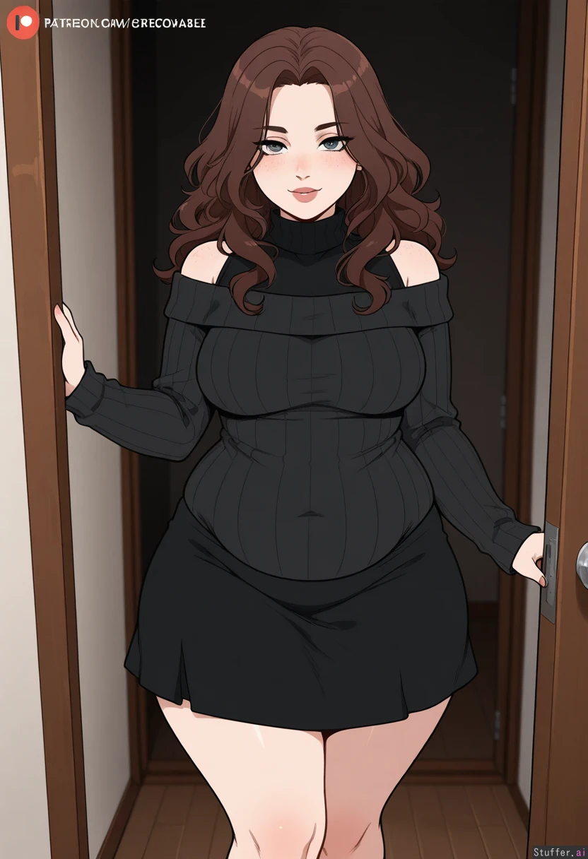 (Kinkymation(artist):0.5),(pudgeruffian(artist):0.3), Dark and nighttime background, 1woman, milf, solo, (simple style), ((less detail)), ((flat colors)), (((high rating))), ((highly detailed face)), high resolution, best quality, detailed eyes, inside apartment Appearance: Long wavy dark hair, gray eyes, pale skin, freckles, bashful blushing, seductive sexy expression, breedable, soft beefy, supple burly, no-glasses, Outfit: (black skirt and snug black sweater shirt) fully clothed, SFW clothes, properly wearing clothes, full coverage clothes, snug clothes, long clothes, Action: looking at viewer, standing, dominant , flirty, seductive Modifiers: Stocky Thick figure:1.5, wide chubby belly:1.2, too thick, thick, fertile breedable feedee-breedee, bulked and plumping, Engorged round medium breasts:1, Chubby sexy waist:1.95, fat thick thighs:1.2, very wide hips:0.95, fat hips, slim arms, small shoulders, thunder thighs, large buttocks,