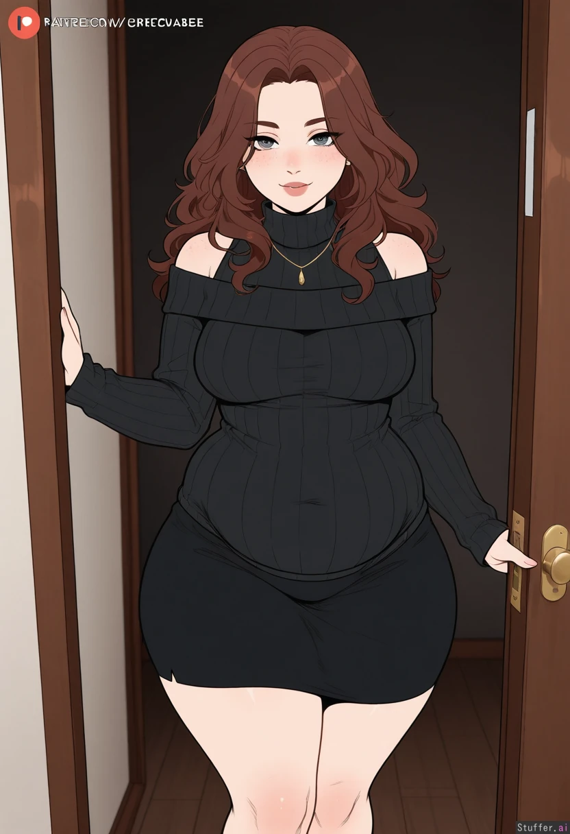 (Kinkymation(artist):0.5),(pudgeruffian(artist):0.3), Dark and nighttime background, 1woman, milf, solo, (simple style), ((less detail)), ((flat colors)), (((high rating))), ((highly detailed face)), high resolution, best quality, detailed eyes, inside apartment Appearance: Long wavy dark hair, gray eyes, pale skin, freckles, bashful blushing, seductive sexy expression, breedable, soft beefy, supple burly, no-glasses, Outfit: (black skirt and knit black sweater shirt) fully clothed, SFW clothes,, snug clothes, full coverage clothes, long clothes Action: looking at viewer, standing, dominant , flirty, seductive Modifiers: Stocky Thick figure:1.5, wide chubby belly:1.2, too thick, thick, fertile breedable feedee-breedee, bulked and plumping, Engorged round medium breasts:1, Chubby sexy waist:1.95, fat thick thighs:1.2, very wide hips:0.95, fat hips, slim arms, small shoulders, thunder thighs, large buttocks,