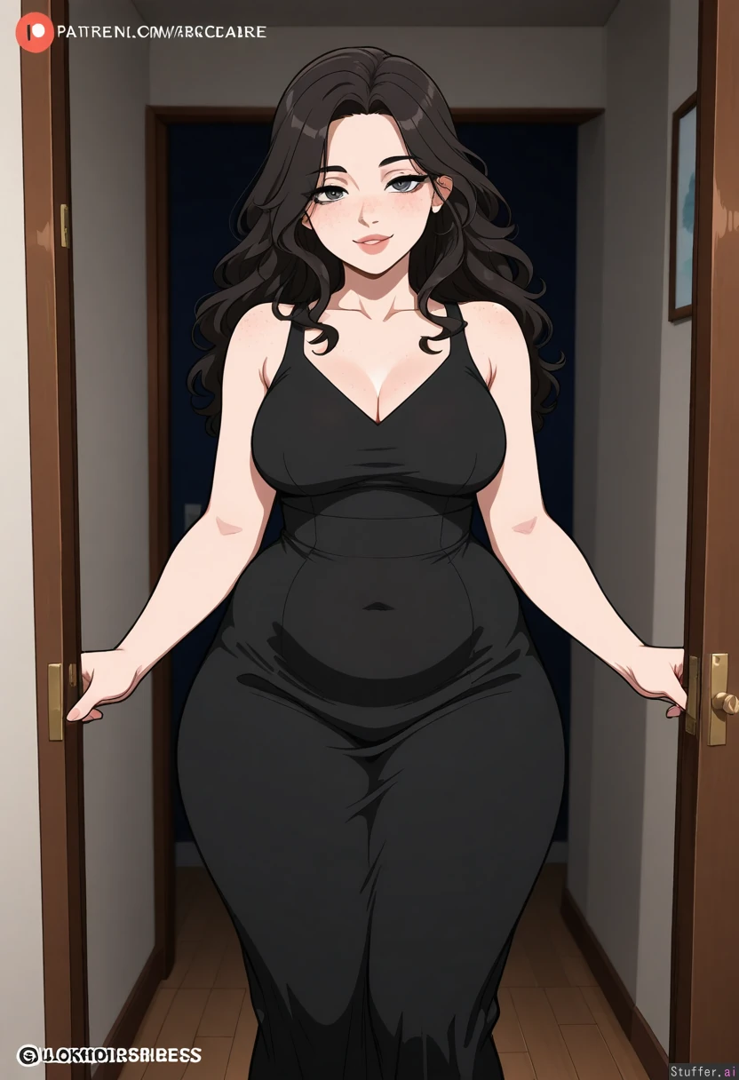 (Kinkymation(artist):0.5),(pudgeruffian(artist):0.3), Dark and nighttime background, 1woman, milf, solo, (simple style), ((less detail)), ((flat colors)), (((high rating))), ((highly detailed face)), high resolution, best quality, detailed eyes, inside apartment Appearance: (Long wavy dark brown black hair) , gray eyes, pale skin, freckles, bashful blushing, seductive sexy expression, breedable, soft beefy, supple burly, no-glasses, Outfit: ( black long dress) fully clothed, SFW clothes,, snug clothes, full coverage clothes, long clothes Action: looking at viewer, standing , (flirty, seductive, horny, aroused, Modifiers: Stocky Thick figure:1.5, wide chubby belly:1.2, too thick, thick, fertile breedable feedee-breedee, bulked and plumping, Engorged round medium breasts:1, Chubby sexy waist:1.95, fat thick thighs:1.2, very wide hips:0.95, fat hips, slim arms, small shoulders, thunder thighs, large buttocks,