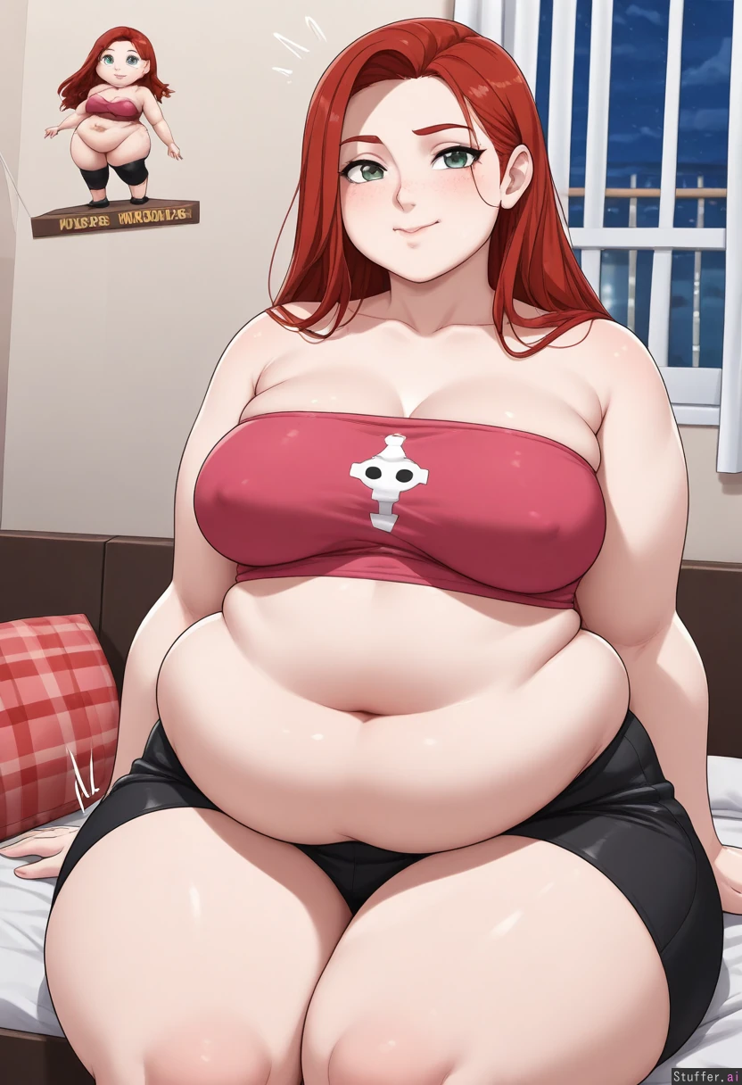 (Kinkymation(artist):0.5), (pudgeruffian(artist):0.3), In a bedroom, night time, 1woman, atom eve (invincible), solo, (simple style), ((less detail)), ((flat colors)), (((high rating))), ((highly detailed face)), high resolution, best quality, detailed eyes, Appearance: Long straight red hair, green eyes, pale skin, freckles, blushing, panting Outfit: ripped clothes (pink tube top and black shorts) Action: looking at the viewer, sitting, out of breath, Modifiers: (Hanging belly:1.3), (morbidly obese ssbbw figure:1.3), (Large breasts:1.2), (Wide waist:1.5), (thick thighs:1.0), (wide hips:1.1), Motion lines, skindentation, nipple outlines, double chin, chubby cheeks,