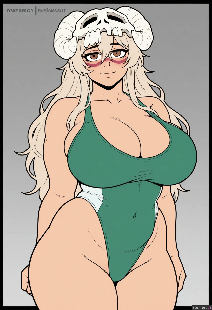 [((Vanripper(art))), (Yu-Gi-Oh!(Art)), (Danganronpa(art)), (Jujunaught(art)),((Flat Colors)), ((4k quality, Simple Art)), ((Thick Outlines)), ((SOLO))] [((Tall, curvy, beautiful, long hair, big eyelashes, light brown eyes))] [((Green swimsuit,))] [(((Nelliel Tu Odelschwank), looking at viewer, blushing furiously, sad eyes, light smile))] [((Dark Blank background))]