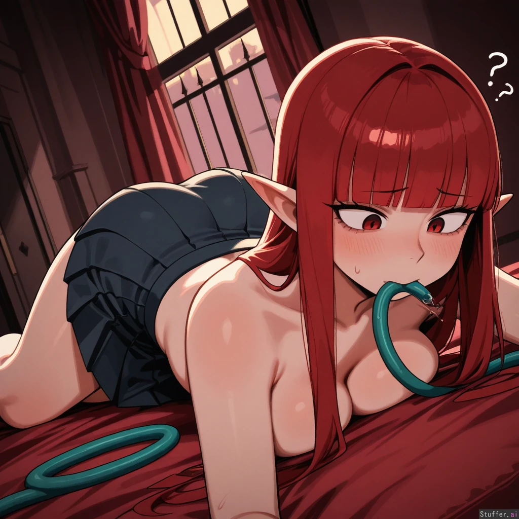 absurdres, 8k, perfect anatomy, masterpiece , beautiful face , lightsource, wamudraws ,,noodlenood, whoopsatro, ohasi, , usa37107692, 1girl, solo , (tall female:1.1), vampire, red_hair, straight_hair , blunt_ends, blunt bangs, pointy ears, topless, black pleated skirt, medium_breasts, castle bedroom , on bed, (laying_on_belly:1), (laying on front:1.2), from_above , (side_view:1.2) , (high-angle_view:1) , off angle, wide_shot , looking_down , hose_in_mouth , confused, full mouth