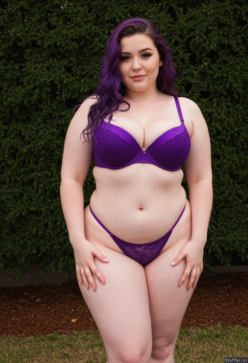 Curvy thick girlfriend Thick wavy purple hair highlights Standing outside Purple push up bra Toned stomach Purple thong Wide Thick curvy Hips