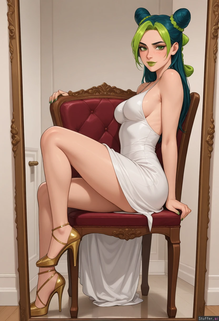 ((High quality Illustration)), ((perfect proportions, perfect anatomy)), solo, ((1 woman)), solo girl, (pewbutt(artist):1.5), (KAMII MOMORU(artist):1.1), (kittew(artist):1.0), (reiq(artist)), (((Jolyne Cujoh))), ((Fair skin, tomboy, green nail polish, adult woman, straight hair, hair half up half in a bun, green eyes, freckles, natural lips)) ((In a bedroom)), pov, sitting on a chair in front of a mirror, doing her makeup, looking back at viewer, Open toed gold heels, long white dress, dark green nail polish, Seductive eyes, horny, blushing, shy expression, smiling, medium breasts, medium thighs, (Skinny:1.2),