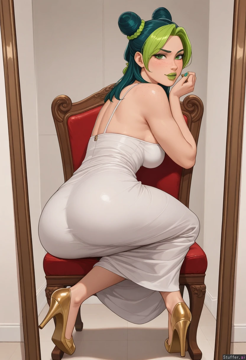 ((High quality Illustration)), ((perfect proportions, perfect anatomy)), solo, ((1 woman)), solo girl, (pewbutt(artist):1.5), (KAMII MOMORU(artist):1.1), (kittew(artist):1.0), (reiq(artist)), (((Jolyne Cujoh))), ((Fair skin, tomboy, green nail polish, adult woman, straight hair, thin green eyebrows, hair half up half in a bun, green eyes, freckles, natural lips)) ((In a bedroom)), pov, sitting on a chair in front of a mirror, doing her makeup, looking back at viewer, Open toed gold heels, long white dress, dark green nail polish, Seductive eyes, horny, blushing, shy expression, smiling, full breasts, thick thighs, (Curvy:1.2),