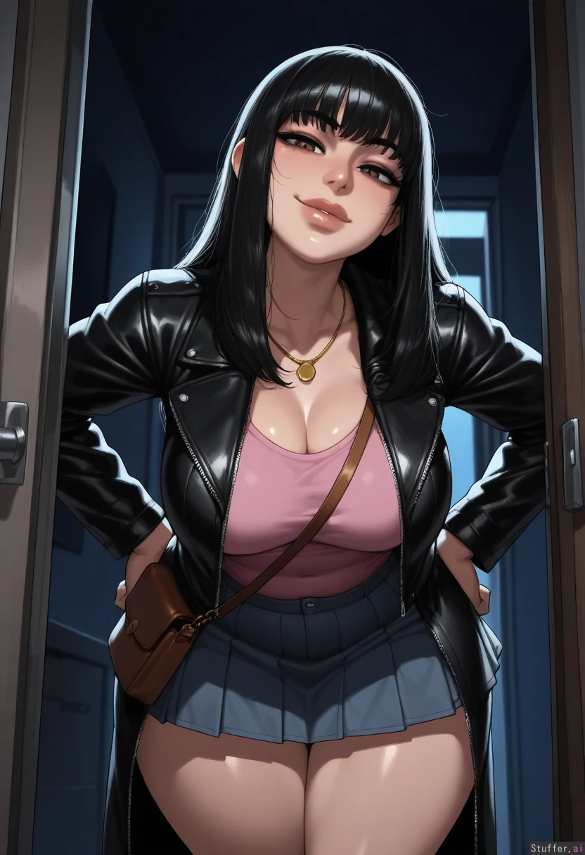 ((solo, krekkov)) (( (fair_skin), brown_eyes, long_hair, bangs, black_hair, long_hair, (thick_lips),)) (( dark_leather_jacket, zipped_up_closed_jacket, light_pink_pleated_layered_mini_skirt, jacket_closed_up, long jacket sleeves, golden_necklace, denim_satchel,)) (( thin_waist, wide_hips)) (( thick_thighs:1.2)) (( medium_breasts:1.1)) (( chubby_belly:1.2)) (( moonlight, (dark room), night, doorway, smirk, low-angle_view, hand_on_hip, leaning_forward, head_tilt))
