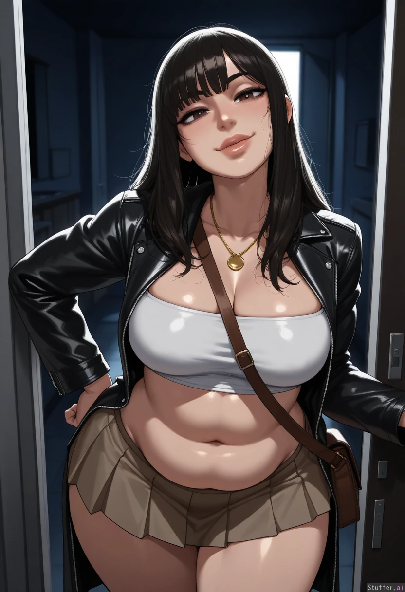 ((solo, krekkov)) (( (fair_skin), brown_eyes, long_hair, bangs, black_hair, long_hair, (thick_lips),)) (( dark_leather_jacket, zipped_up_closed_jacket, white_tube_top, light_brown_pleated_mini_skirt, long jacket sleeves, golden_necklace, denim_satchel_slung_over_shoulder,)) (( thin_waist, wide_hips)) (( thick_thighs:1.2)) (( medium_breasts:1.2)) (( chubby_belly:1.3)) (( moonlight, (dark room), night, doorway, smirk, side-angle_view, hand_on_hip, leaning_forward, head_tilt))