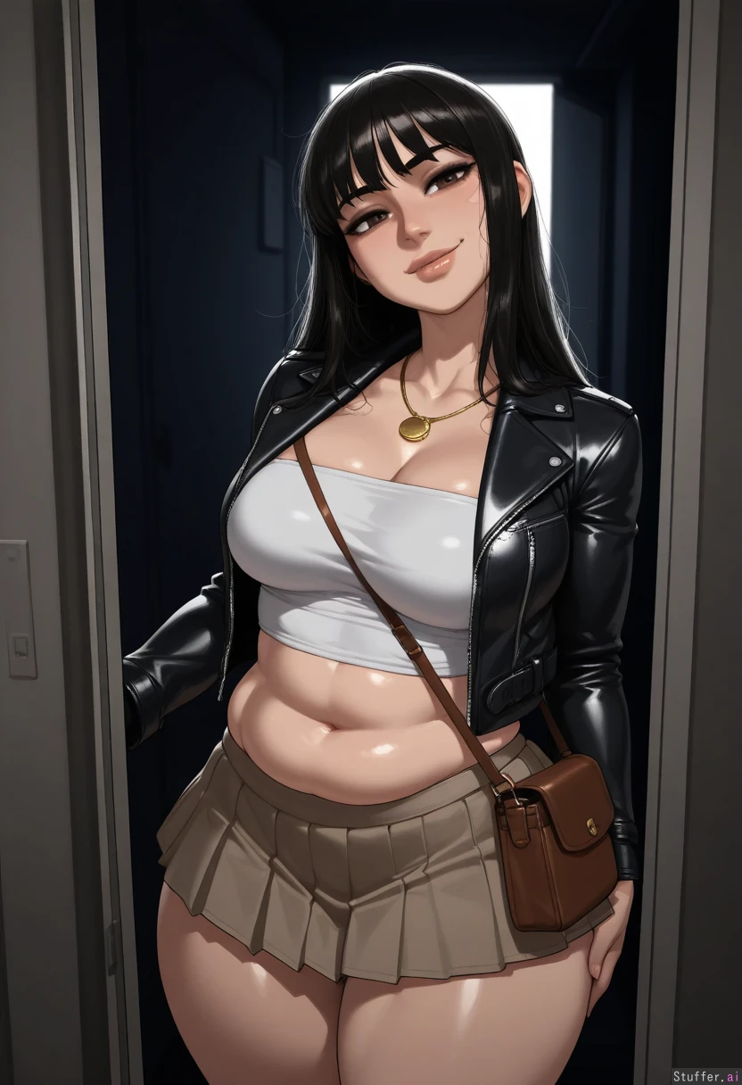 ((solo, krekkov)) (( (fair_skin), brown_eyes, long_hair, bangs, black_hair, long_hair, (thick_lips),)) (( dark_leather_jacket, zipped_up_closed_jacket, white_tube_top, light_brown_pleated_mini_skirt, long jacket sleeves, golden_necklace, denim_satchel_slung_over_shoulder,)) (( thin_waist, wide_hips)) (( thick_thighs:1.2)) (( medium_breasts:1.2)) (( chubby_belly:1.3)) (( moonlight, (dark room), night, doorway, smirk, back_view, hand_on_butt, head_tilt))