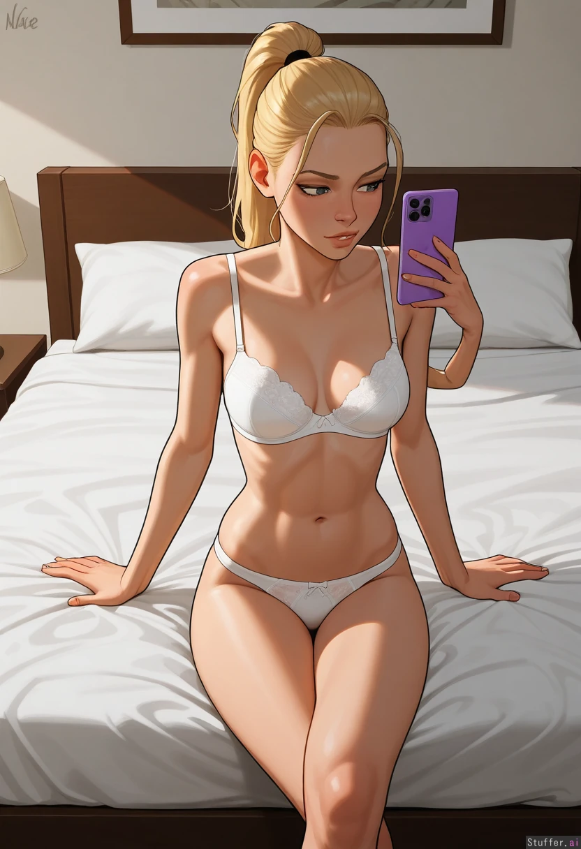 Incase(artist), 1 people, solo, nude 1girl, first girl is Marcy is eighteen, blonde, blonde ponytail, supermodel face, skinny hips, topheavy, skinny thighs, skinny, medium breasts, (white bra), (white lacy panties,) on bed, sitting cross legged, horny, looking at phone In Bedroom