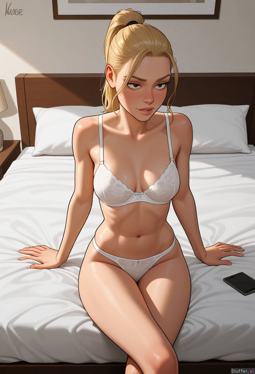 Incase(artist), 1 people, solo, nude 1girl, first girl is Marcy is eighteen, blonde, blonde ponytail, supermodel face, skinny hips, topheavy, skinny thighs, skinny, medium breasts, (white bra), (white lacy panties,) on bed, sitting cross legged, horny expression, (looking at phone) In Bedroom