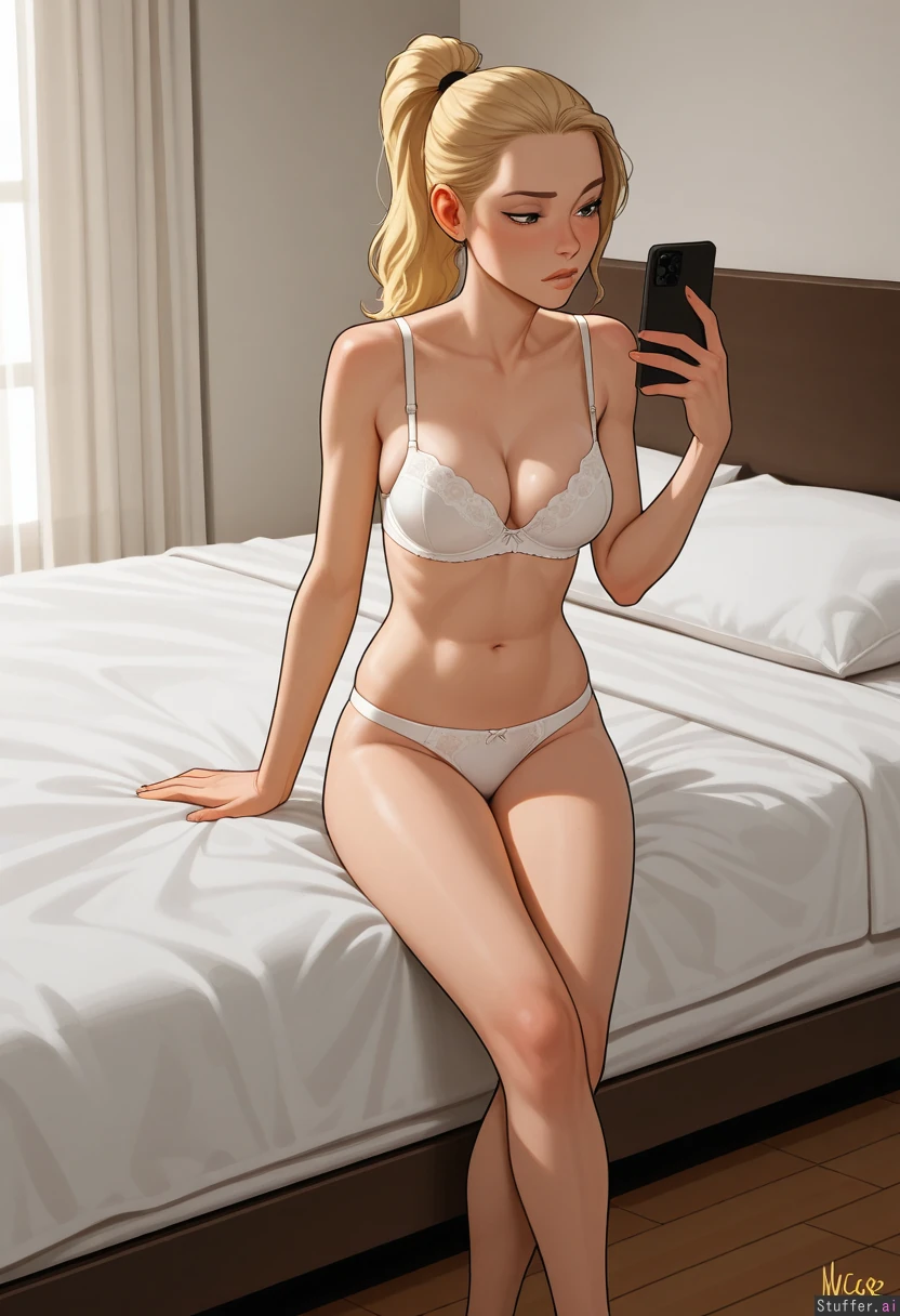 Incase(artist), 1 people, solo, nude 1girl, first girl is Marcy is eighteen, blonde, blonde ponytail, supermodel face, slim hips, topheavy, slim thighs, freckled, 5.5 feet tall, swollen fat breasts, skinny, (Undersized white bra), (white lacy panties,) on bed, sitting cross legged, horny, looking at phone, holding phone In Bedroom