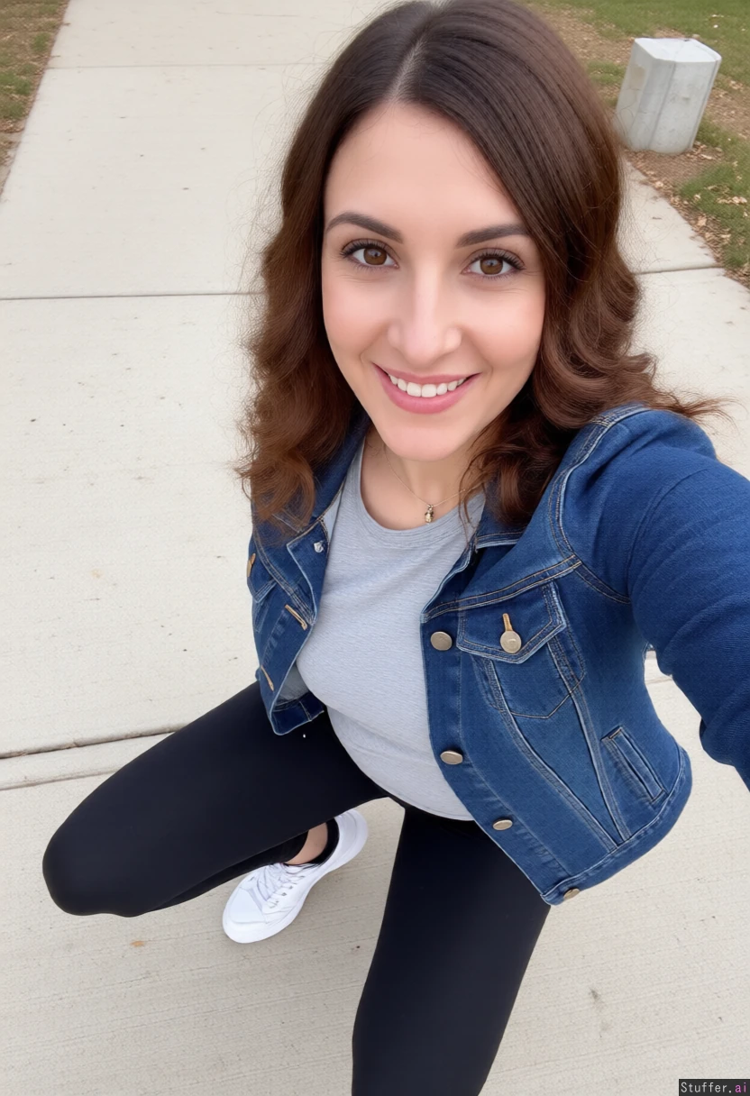 A woman on one knee on the sidewalk, black leggings, white sneakers, grey tee shirt, jean jacket, small bell necklace, wavy brown hair, brown eyes, smiling