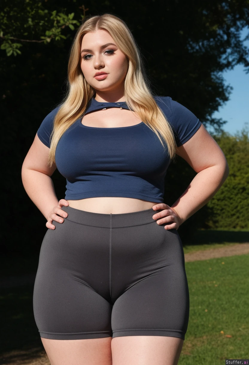 Hyper realistic, 20 year old, gorgeous face, beautiful, attractive facial features, blue eyes, defined jawline, (extremely slim face), long blonde flowing hair, Makeup, lashes eyeliner, (front view), (Frontal full body view)(front view:1.8) (Fully clothed:1.8) ((Full tight smooth dark_grey Spandex shorts:1.8)), (tight collared polo crop top) (curvy:1.4) (thick thighs:1.6) ((wide hips)) (Perfect bbw body) Standing outdoors perfect lighting