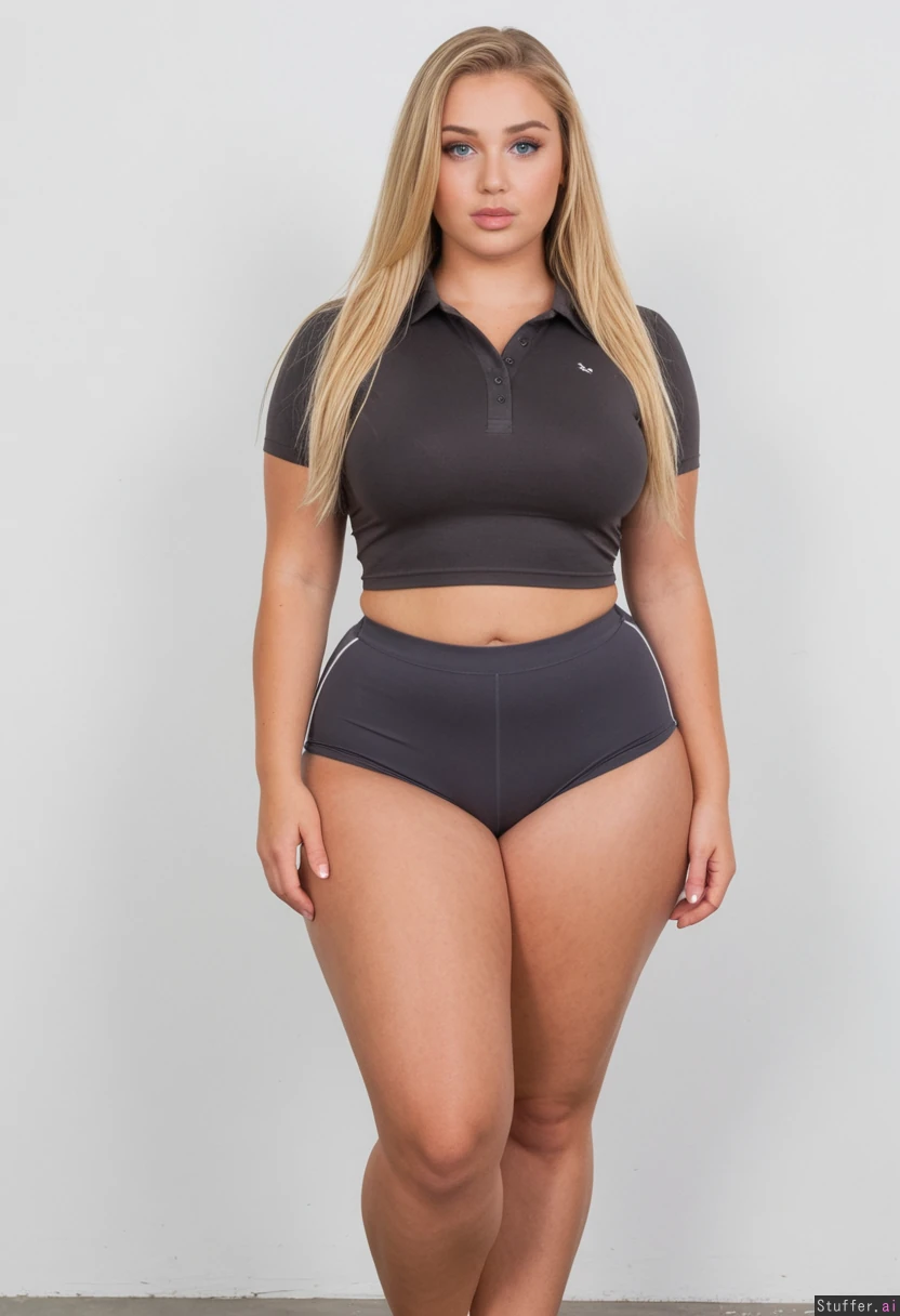 Hyper realistic, 20 year old, gorgeous face, beautiful, attractive facial features, blue eyes, defined jawline, (extremely slim face), long blonde flowing hair, Makeup, lashes eyeliner, (((front view))), (Frontal full body view)(front view:1.8) (Fully clothed:1.8) ((Full tight smooth dark_grey Spandex shorts)), (tight preppy cotton collared polo crop top) ((thighs)) ((wide hips)) ((Curvy: 1.5)) (Perfect fat body) Standing outdoors perfect lighting