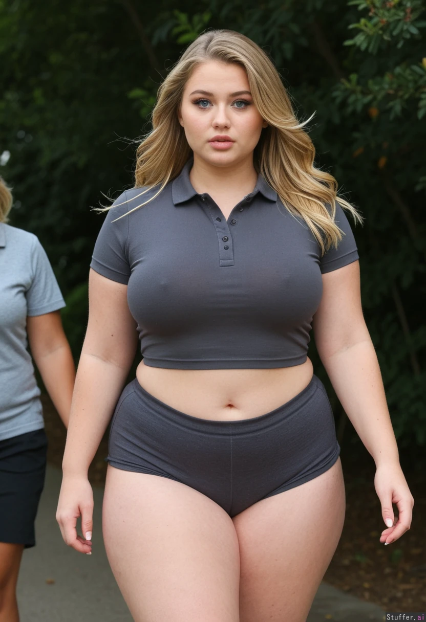 Hyper realistic, 20 year old, gorgeous cute face, curious, beautiful, extremely attractive facial features, blue eyes, defined jawline, (extremely slim pretty face), long blonde tousled hair, Makeup, lashes eyeliner, (((Front view))), ((walking towards viewer)) (Fully clothed:1.8) ((Full dark_grey Spandex shorts)), (tight preppy cotton collared polo crop top) ((wide hips)) (Curvy: 1.3) (Perfect round plus size body) Walking outdoors perfect lighting