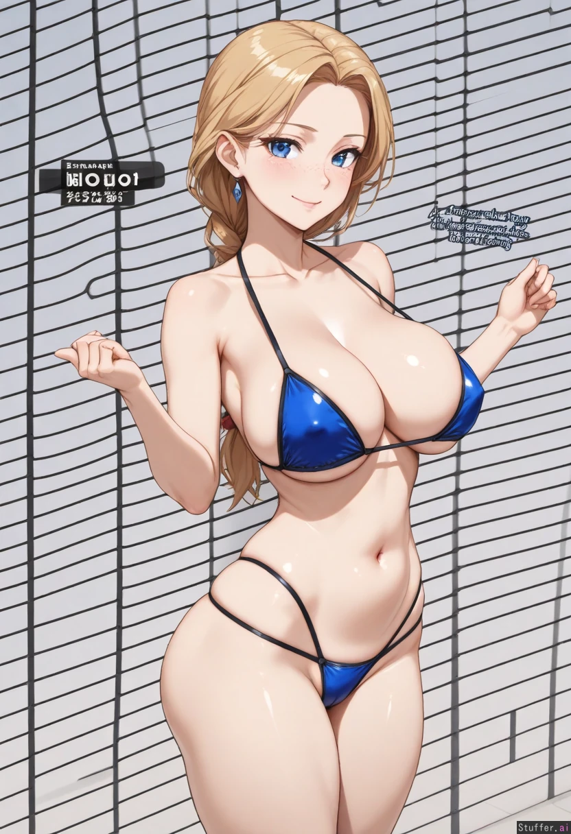 Never enough bites(art style), sweetdreamcoffee_artist, retro (art style) beautiful, intricate details, masterpiece, masterpiece, (((highly detailed))), ((flawless)), (((high rating))), ((highly detailed face)), full resolution, 8k, high resolution, best quality, 1woman, milf, detailed eyes, ((solo)) Appearance: Long blonde hair, Big blue eyes, pale skin, freckles, blushing heavily, anime-woman, sexy sly smile, Outfit: blue bikini, black thong Location: at the beach (posing at beach), side-view, looking at self Modifiers: (Slim figure:1.6), (Big fat belly:0.85), (morbidly obese ssbbw figure:0.85), (Large breasts:0.90), (breast expansion), topheavy, erect nipples (Narrow waist:1.0), (thick thighs:1.0), ((Impressive oversized thighs)) (wide hips:1.0),