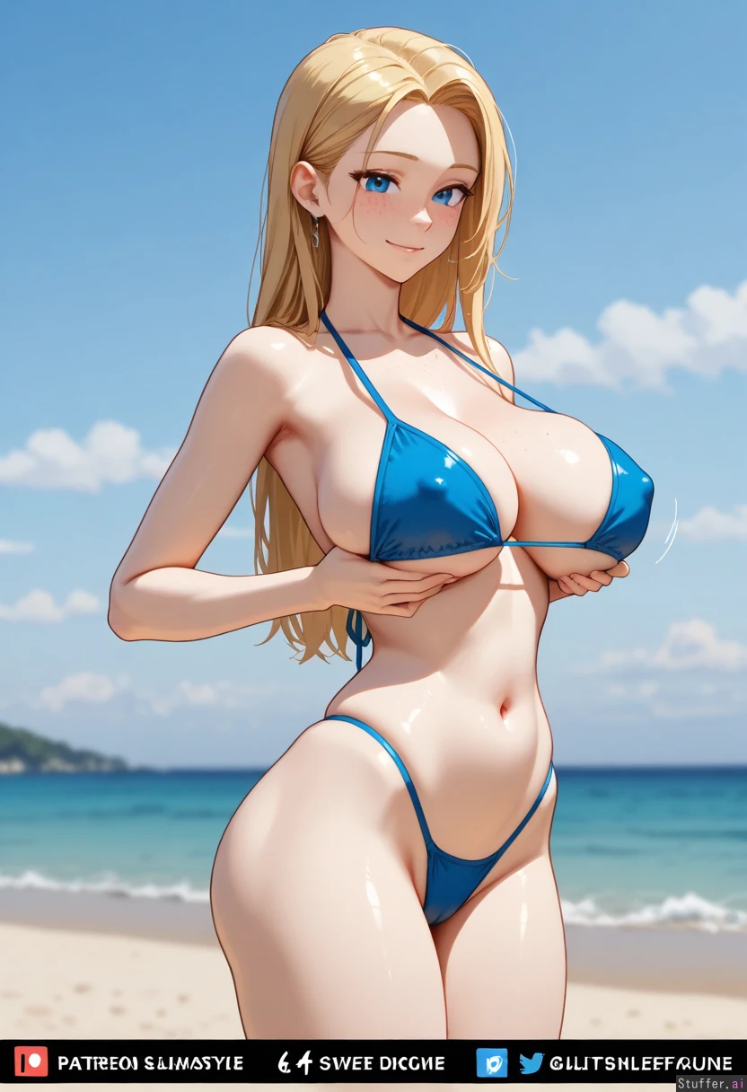 Anime artwork. Never enough bites(art style), sweetdreamcoffee_artist, retro (art style) beautiful, intricate details, masterpiece, masterpiece, (((highly detailed))), ((flawless)), (((high rating))), ((highly detailed face)), full resolution, 8k, high resolution, best quality, 1woman, milf, detailed eyes, ((solo)) Appearance: Long blonde hair, Big blue eyes, pale skin, freckles, blushing heavily, anime-woman, sexy sly smile, Outfit: blue bikini, black thong Location: at the beach (posing at beach), side-view, looking at self Modifiers: (Slim figure:1.6), (Big fat belly:0.85), (morbidly obese ssbbw figure:0.85), (Large breasts:0.90), (breast expansion), topheavy, erect nipples (Narrow waist:1.0), (thick thighs:1.0), ((Impressive oversized thighs)) (wide hips:1.0),