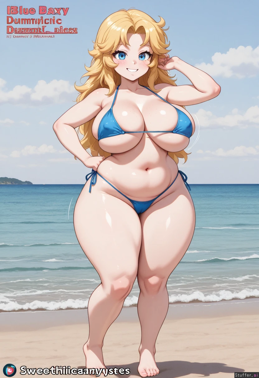 Anime artwork. Never enough bites(art style), sweetdreamcoffee_artist, retro (art style) beautiful, intricate details, perfect anatomy.. masterpiece, masterpiece, (((highly detailed))), ((flawless)), (((high rating))), ((highly detailed face)), full resolution, 8k, high resolution, best quality, 1woman, hotchick, detailed eyes, ((solo)) Appearance: Long blonde hair, Big blue eyes, pale skin, freckles, blushing heavily, anime-woman, sexy sly smile, Outfit: blue bikini, black thong Location: at the beach (posing at beach), fullbody front view, Modifiers: (Dummythiiicc:1.6), (soft squishable belly), (bottomheavy breedable figure:0.85), (Large breasts:0.90), (breast expansion), topheavy, erect nipples (Narrow waist:1.0), (thick thighs:1.0), (((Impressive oversized thighs))) (wide hips:1.0),