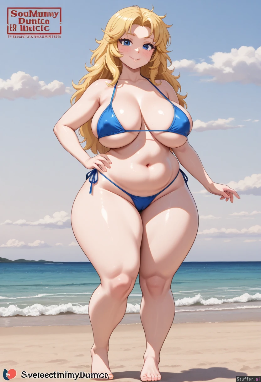 Anime artwork. Never enough bites(art style), sweetdreamcoffee_artist, retro (art style) beautiful, intricate details, perfect anatomy.. masterpiece, masterpiece, (((highly detailed))), ((flawless)), (((high rating))), ((highly detailed face)), full resolution, 8k, high resolution, best quality, 1woman, hotchick, detailed eyes, ((solo)) Appearance: Long blonde hair, Big blue eyes, pale skin, freckles, blushing heavily, anime-woman, sexy sly smile, Outfit: blue bikini, black thong Location: at the beach (posing at beach), fullbody front view, Modifiers: (Dummythiiicc:1.6), (soft squishable belly), (bottomheavy breedable figure:0.85), (Squished_softboobs) erect nipples (Narrow waist:1.0), (thick thighs:1.0), ((((Impressive oversized thighs)))) (wide hips:1.0),