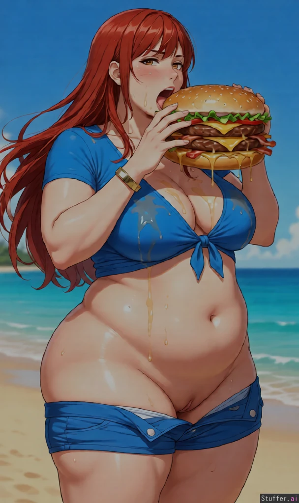Anime artwork. Stunningly beautiful face. Mid20s Redhead.. Named Nadia Grassa. long flowing hair. Curvage post. Feedee, Standing at a beach. eating a supersized WG burger.. *with 2 3inch meat patties, quality lettuce and tomato. Cheese and bacon.* best damn burger She's ever had... juicy mouth watering delicious. Highly addictive... Weight goes to the thighs.. ***that oversized burger will make her a BBW in no time at all...*** burger grease dripping on her shirt.((make her fatter)) blue short sleeved tied_top, *top stained with grease* cleavage.. frontboob. no_bra. and bootyshorts. **flybutton popped!..** Clothes struggling to cover softness.. thick_thighs, ((((((((Impressive oversized thighs)))))))) fat vulva, bulbous vagbulge, plumped fatlips, Big bouncy rear, ((SHE'S FILLING OUT!!!+++++++++)) Big soft squishy squishable belly!!! Long belly. Belly bump.. heavy belly overhang... Overhanging belly in way of zipper and button; she can't close her shorts anymore.. noticable pantie V. [[Consistent image edits]] She's had multiple of those burgers.. (((SHE'S FILLING OUT!!!!!!+++++++++++++++:what a good feedee.))) [[WEIGHT SHE'S GAININ' IT!]]