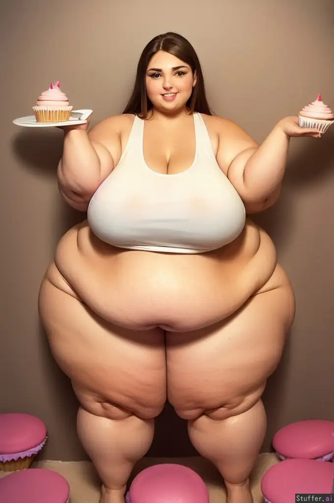 Masterpiece.realistic.intricate details. 1girl. girl beauty.((gorgeous pretty face)).brown wavy hair.(heavy_saggy) (tanktop and shorts) ((gorgeous beautiful face))((seducitve smile))((obese paunch)). full body.chubby arms. chubby knees.(chubby ankles).((desert shop with thousands of cupcakes)) ((super smooth skin)) ((extremely curvy))((obese curvy))((gigantic curves))((gigantic obese hips))((gigantic obese thighs))((gigantic obese butt))((gigantic obese belly))