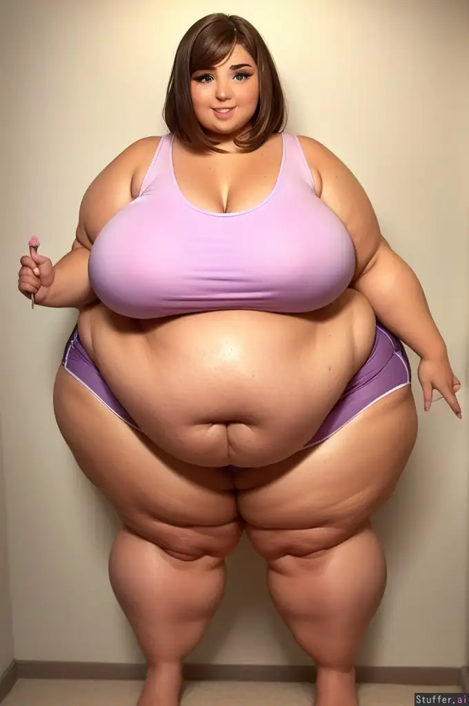 Masterpiece.realistic.intricate details. 1girl. girl beauty.((gorgeous pretty face)).short brown wavy hair (tanktop and shorts) ((gorgeous beautiful face))((beautiful gorgeous eyes))((seducitve smile))full body.chubby arms. chubby knees.(chubby ankles).((desert shop with thousands of cupcakes)) ((super smooth skin:1.3)) ((extremely curvy))((obese curvy))((gigantic curves))((hyper gigantic obese hips))((hyper gigantic obese thighs))((hyper gigantic obese butt))((gigantic obese belly))((hands on her belly)) ((hyper USSBBW))