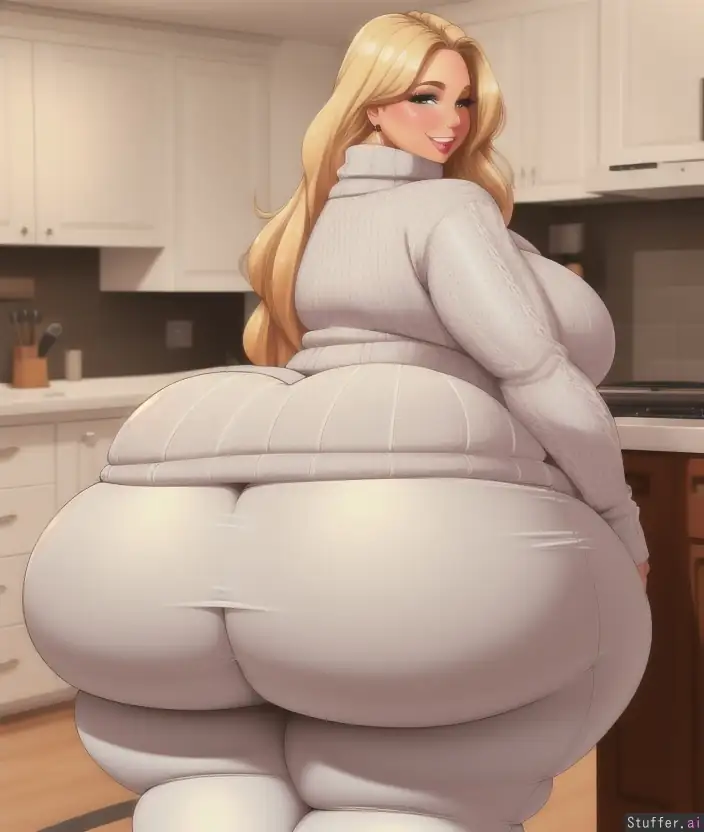High quality, curvy bbw woman, long flowing blonde hair, extremely bottom heavy, (((enormous hips))), (((massive butt))), (sweet smile), feminine, modest, (cozy sweater), (pants ripping), highly detailed face, sensual look, (thick thighs), kitchen