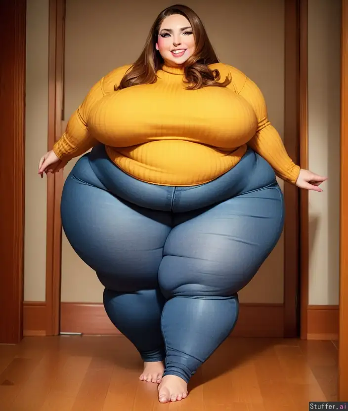 High quality, perfect anatomy, curvy bbw woman, long flowing brown hair, extremely bottom heavy, (((enormous hips))), (((gigantic thighs))), (sweet smile), feminine, modest, (cozy sweater), (pants ripping), highly detailed face, sensual look, (love handles), (narrow waist) doorway