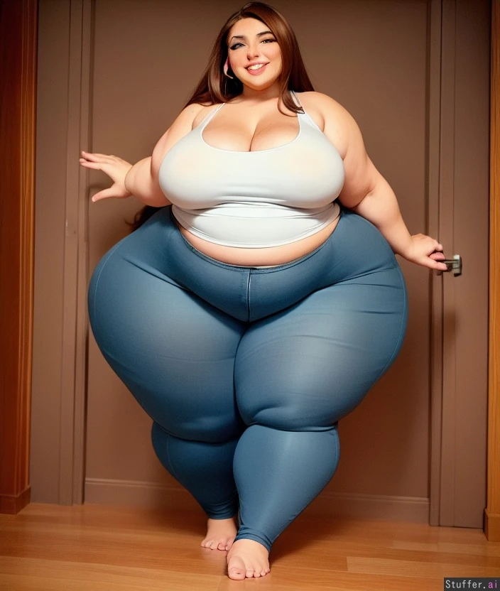 High quality, perfect anatomy, curvy bbw woman, long flowing brown hair, extremely bottom heavy, (((enormous hips))), (((gigantic thighs))), (sweet smile), feminine, modest, (tanktop), (pants ripping), highly detailed face, sensual look, (love handles), (narrow waist) doorway