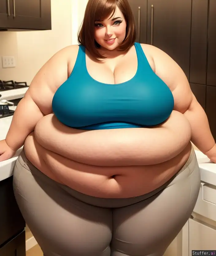 High quality, perfect anatomy, curvy USSBBW woman, short flowing brown hair, ((gorgeous face))((gorgeous eyes))((gorgeous hair))((thin face)), extremely bottom heavy, (((hyper gigantic hips))), (((hyper gigantic thighs))), (sweet smile), feminine, modest, (tanktop), (pants ripping), highly detailed face, sensual look, (love handles), (narrow waist) (in a kitchen) ((gigantic belly))((exaggerated wide curves)) ((hyper chubby))